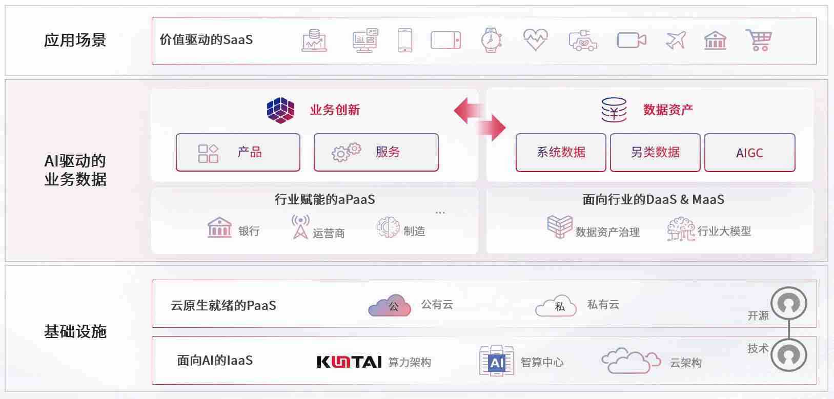 数字时代,,围绕企业数字化转型的关键要素,,,菠菜论坛数码开创性的提出数云融合战略和技术体系框架,,着力在云原生、、数字原生、、、、AI原生和信创产业上架构产品和服务能力,,,为处在不同数字化转型阶段的快消零售、、汽车、、金融、、、医疗、、、政企、、、教育、、、、运营商等行业客户提供泛在的敏捷IT能力和融合的数据驱动能力,,构建跨界融合创新的数字业务场景和新业务模式,,,,助力企业级客户建立面向未来的核心能力和竞争优势,,,,全面推动社会的数字化、、、智能化转型升级。。