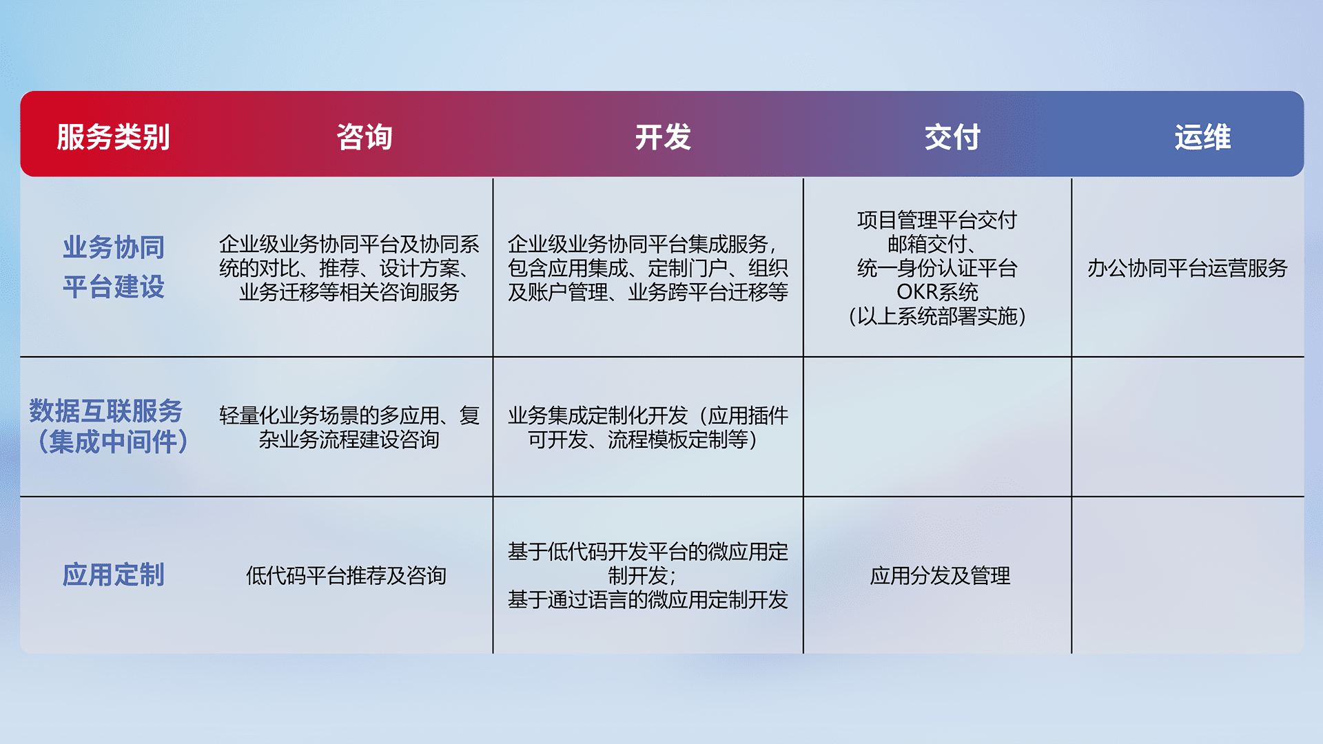 针对钉钉、、、企微、、、IDaas等平台级产品提供产品的规划、、方案、、、交付、、、、定制化开发等服务,,实现如统一协同办公、、、、智能客户服务、、、、混合会议管理、、智能数据查询、、、、等业务场景,,,实现数字化转型。。。。