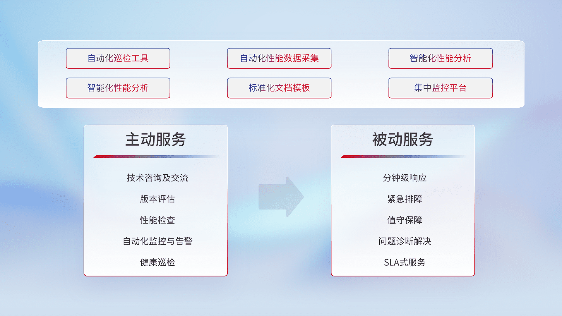 智能化工具和标准化文档,,,,保障服务质量,,提供主动服务(包含技术咨询、、、、版本评估、、性能检查、、、自动化监控与告警、、、、健康巡检)和被动服务包含(分钟级响应、、、、紧急排障、、、值守保障、、、问题诊断解决、、、、SLA服务)。。。。